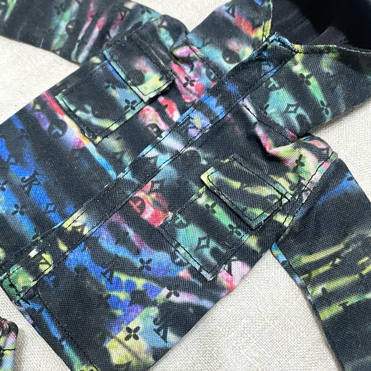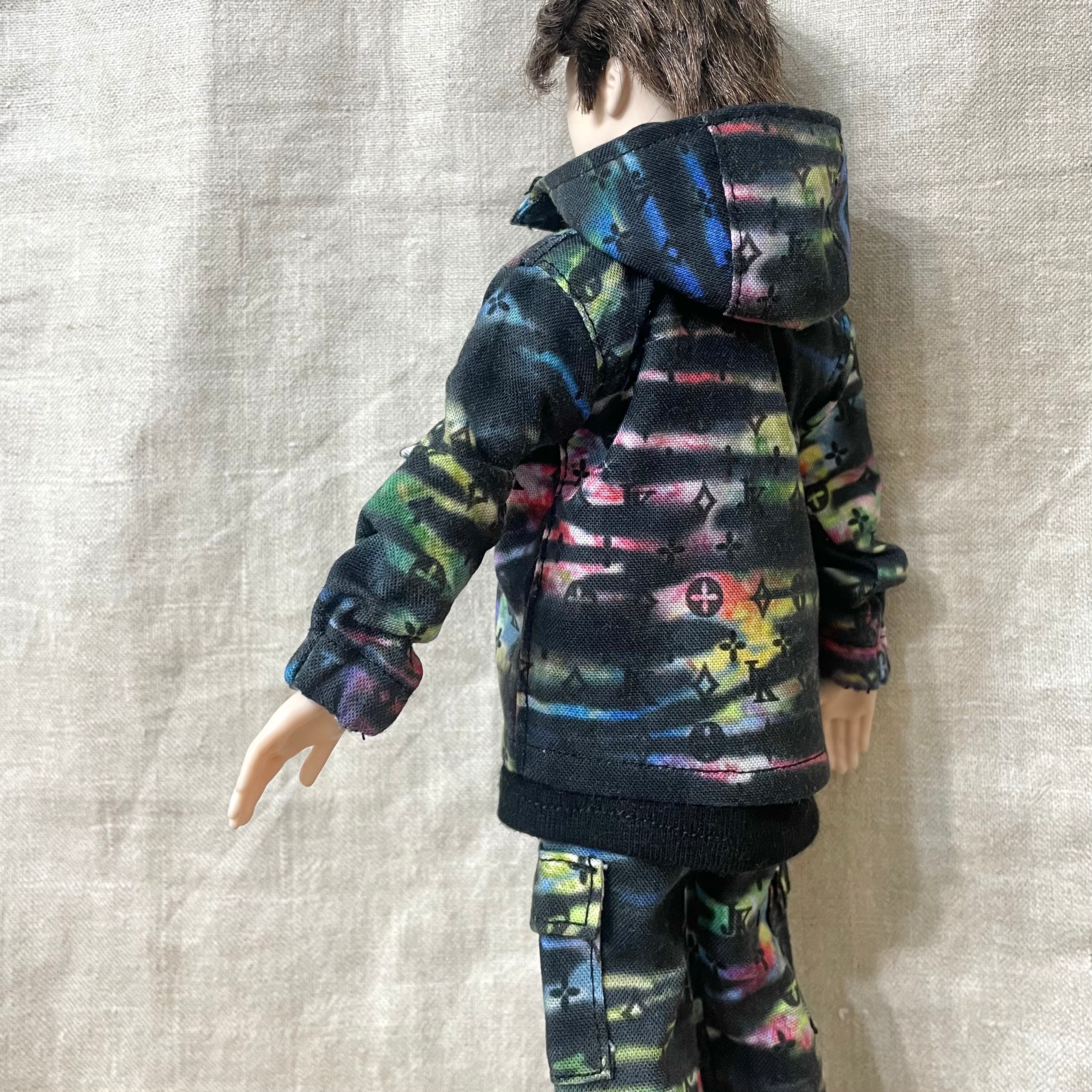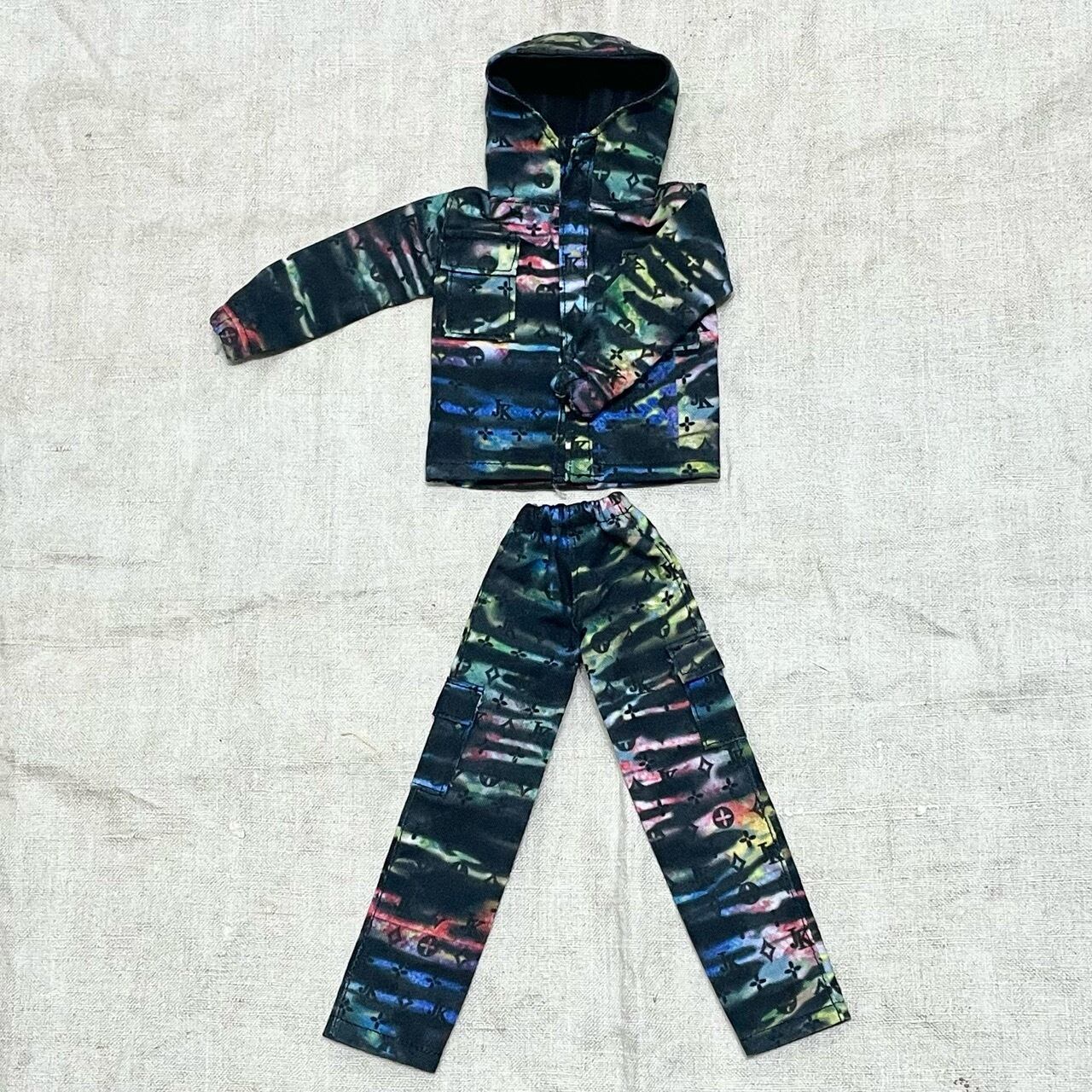 モノグラムロゴとタイダイ染めのベースがポイントの迷彩ジャケットとパンツのセットアップです。